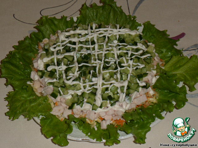 Салат выложить слоями, каждый слегка смазывая майонезом (я выкладываю майонез в полиэтиленовый кулечек, отрезаю уголок и просто наношу его сеточкой).