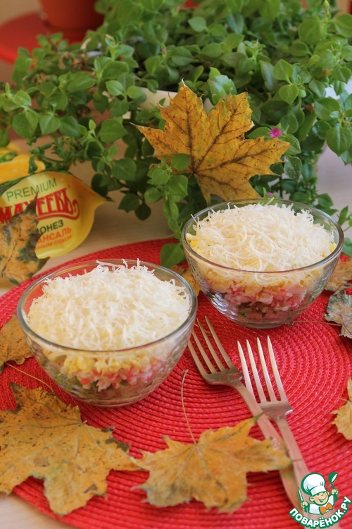 3 слой-крабовые палочки натереть на тёрке, смазать майонезом;