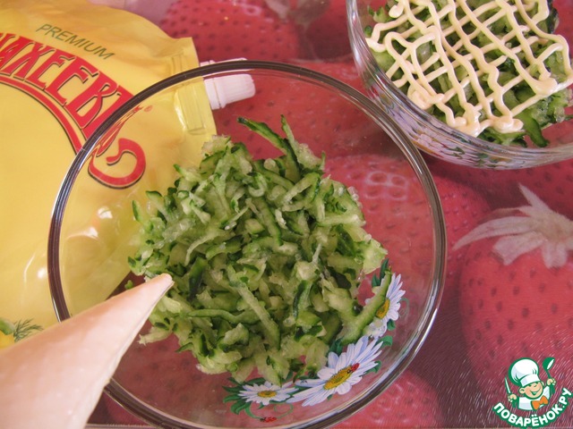 2 слой-огурец на крупной тёрке (лишнюю жидкость отжать), смазать майонезом;