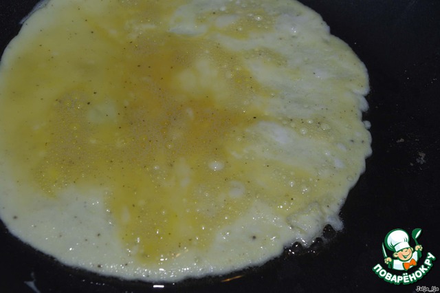 2 яйца по очереди взбиваем с солью и чёрным перцем. Поджариваем блинчики.