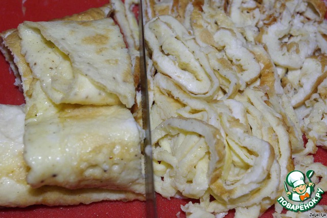 Первым слоем выкладываем яичную соломку - в форме лапы тигра.