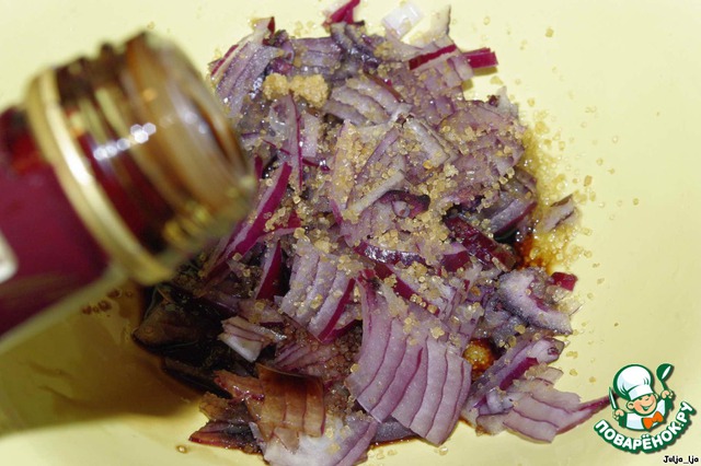 Лук слегка посыпаем сахаром и поливаем уксусом (1 ст.л.).
