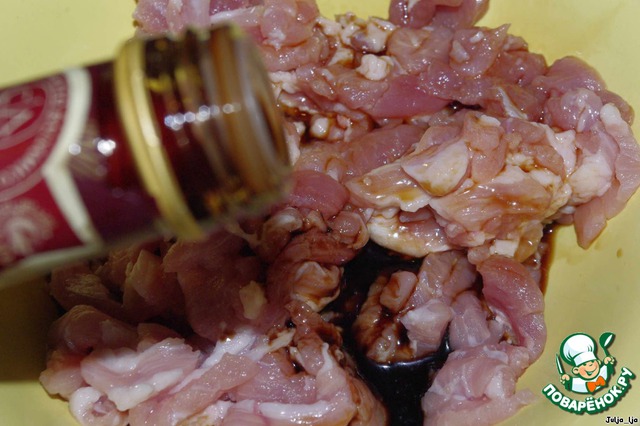 Нарежем его соломкой. Замаринуем в соевом соусе и бальзамическом уксусе (соус используем весь, а уксус - 1 ст.л.)