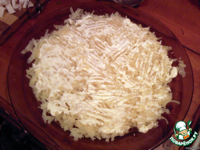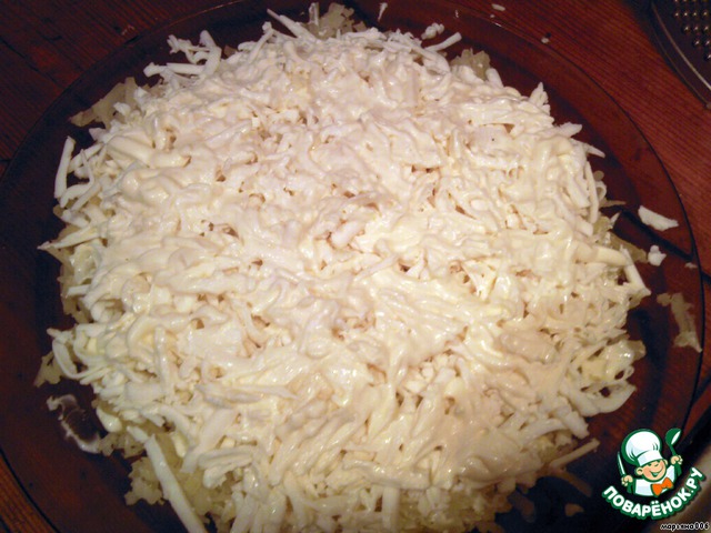 Сверху второй слой тертый сырок с чесноком и смазанный слегка майонезом