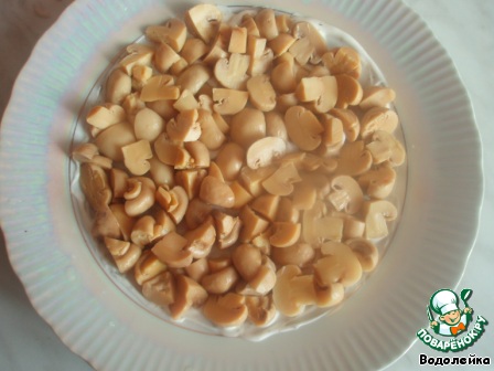 Дальше выкладываем шампиньоны так, чтобы они только покрыли дно блюда(класть много не нужно). Если грибы мелкие, их можно класть целыми, если нет - то порезать их пополам или на четвертинки.