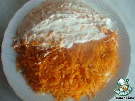 На лук выкладываем слой морковки так, чтобы морковка хорошо накрыла слой лука.