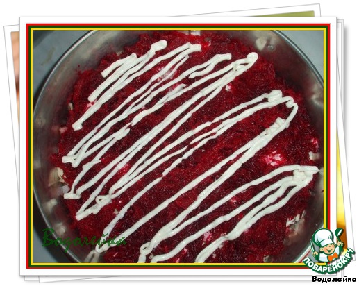 4 слой - натертая на мелкой терке свекла + сеточка из майонеза.