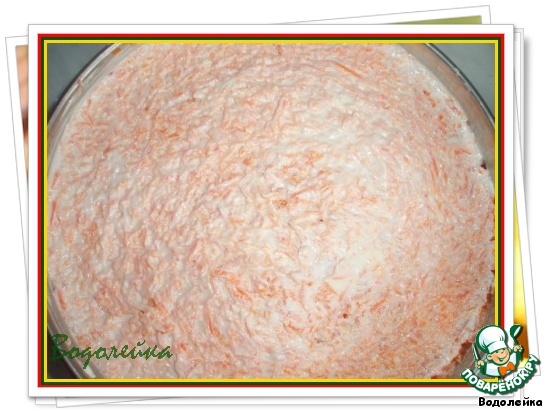 8 слой - морковь, натертая на мелкой терке. Этот слой смазать тонким слоем майонеза.