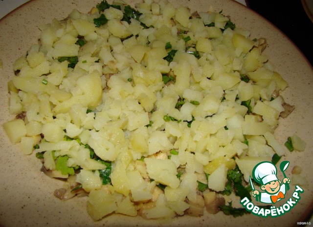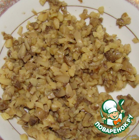 Залили майонезом,поставили в сторону пропитываться))Мелко рубим оставшиеся шампиньоны ,солим,перчим...чеснок
