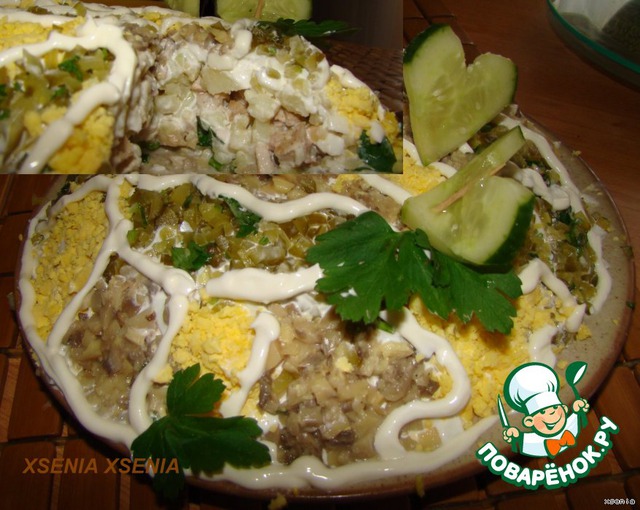 Салат я выкладываю слоями в таком порядке :Грибы (две трети маленькой банки)+Зелень петрушки+Картофель+Мясо (Кубиками)+Зеленый горошек+Майонез +Свежий огурец+Мясо+Картофель+Белок+Майонез