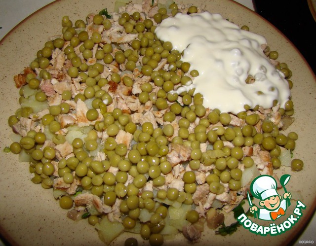 Второе...Майонез я разбавляю огуречным рассолом...до консистенции сметаны...Грибы консервированные мелко режу..солю..перчу..добавляю чесночек..