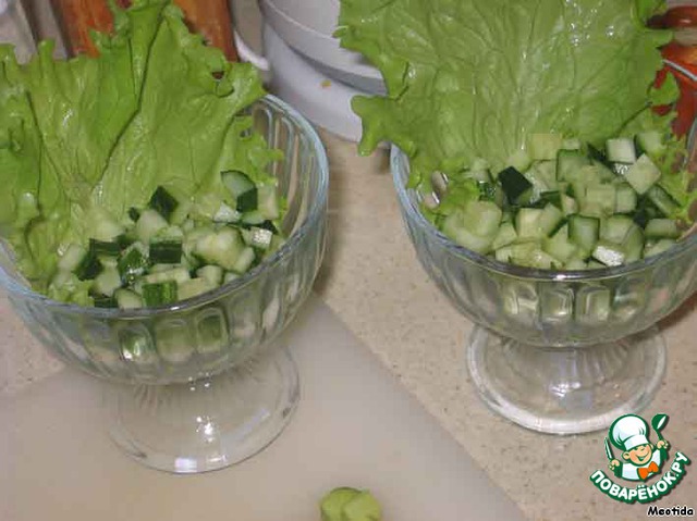 в стаканчики или на общую тарелку выкладываем листики салата, сверху порезанный кубиками огурчик