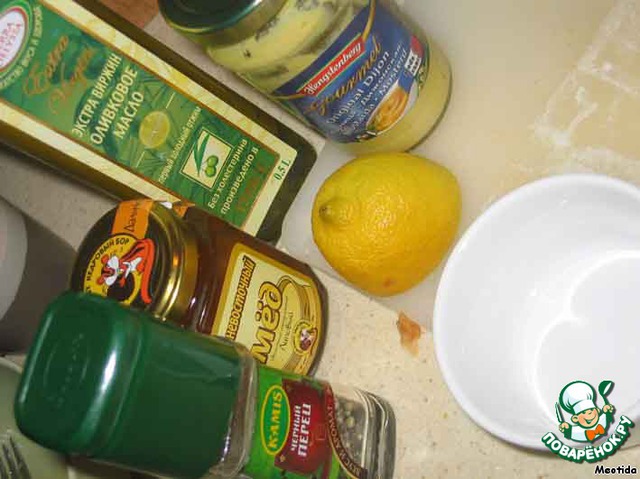 хорошенько смешиваем мед, горчицу, оливковое масло (можно взять растительное без запаха...но с оливковым вкуснее), лимонный сок, приправляем перчиком..