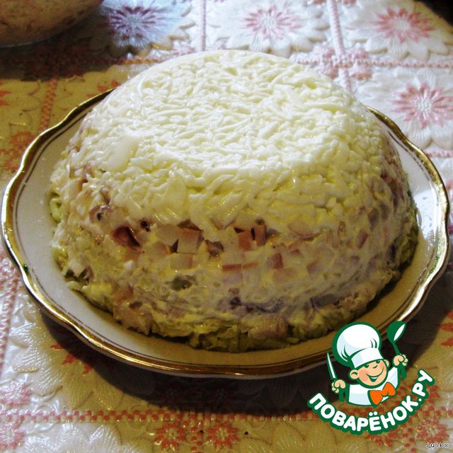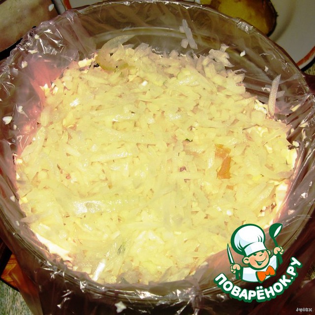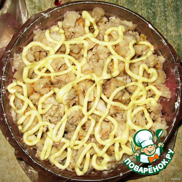 Последний слой у нас- потертый картофель, сваренный в мундире. Посолить. Майонезом не поливать!