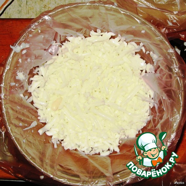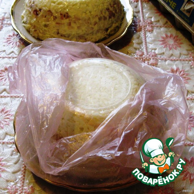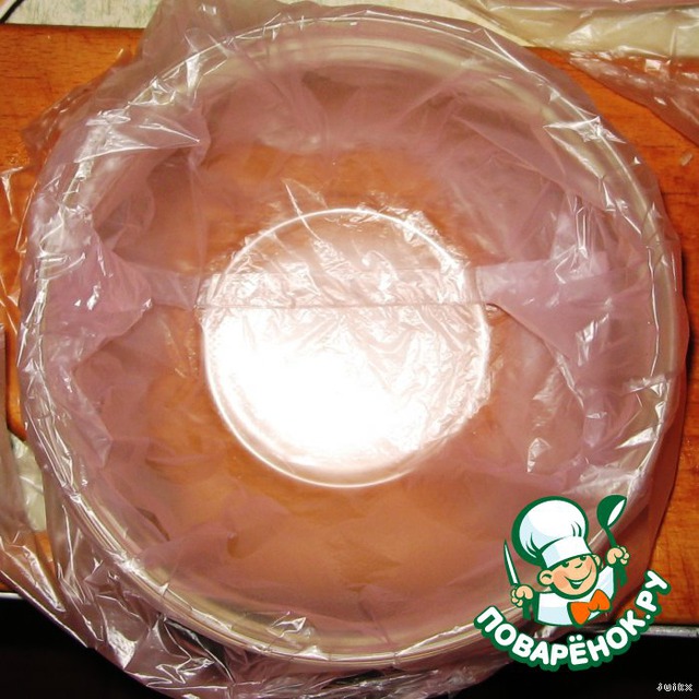 В салатник относительно глубокий выстелить обычный пищевой кулек и разровнять.