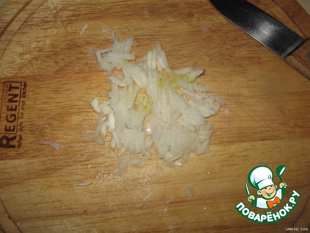 Лук я нарезаю очень-очень мелко и беру его четвертинку от маленькой луковички. Вот столько.