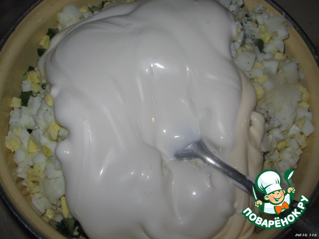 Посолить, поперчить и добавить майонез. Как альтернатива майонезу, можно заправить салат сметаной+горчица+сахар (немного). Получится новый интересный вкус.
