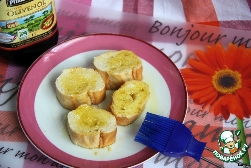 Багет нарезать кусочками толщиной по 2-3 см и смазать оливковым маслом. Выложить в форму для запекания и запекать 5-8 мин.