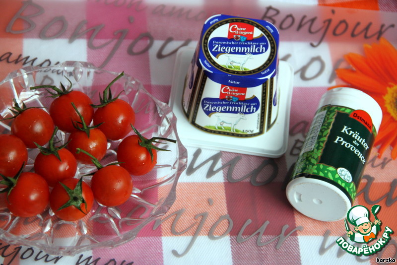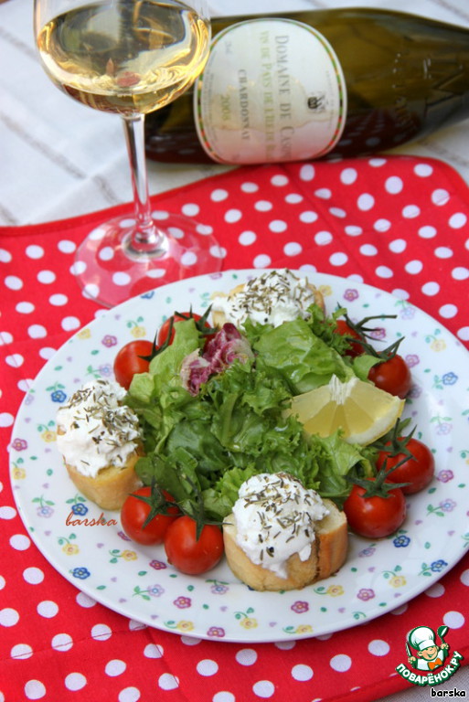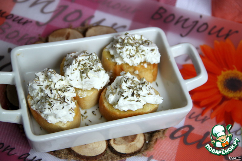 На каждый кусочек багета выложить по 1-1,5 ч. л. козьего сыра и посыпать прованскими травами. Продолжать запекать в духовке ещё 3-5 мин.