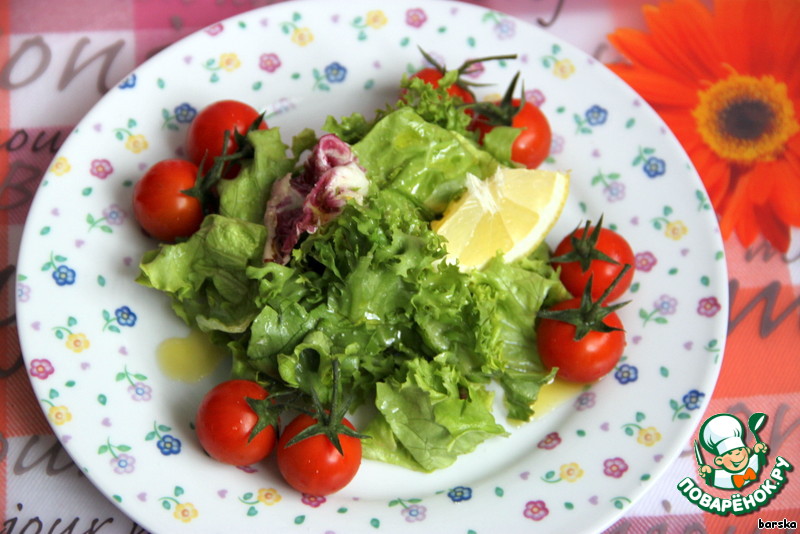 Подготовить тарелки: выложить посередине салатную смесь, посолить, полить оливковым маслом, по бокам - помидорки и толстый ломтик лимона.