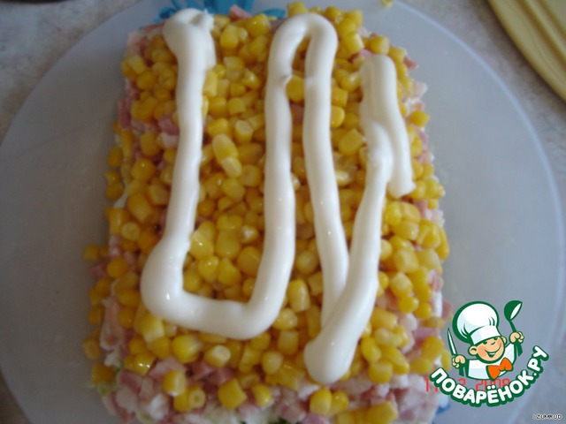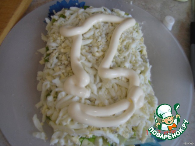 из кондитерского мешочка выдавливаем тонко майонез делая ворота и разметку поля