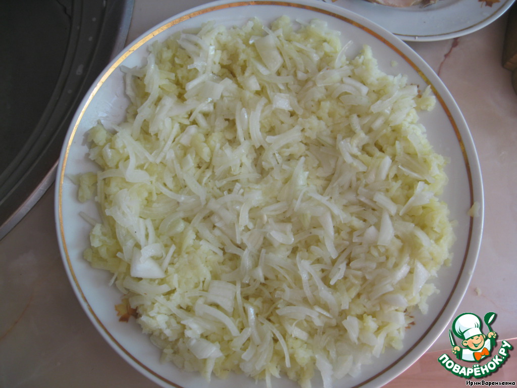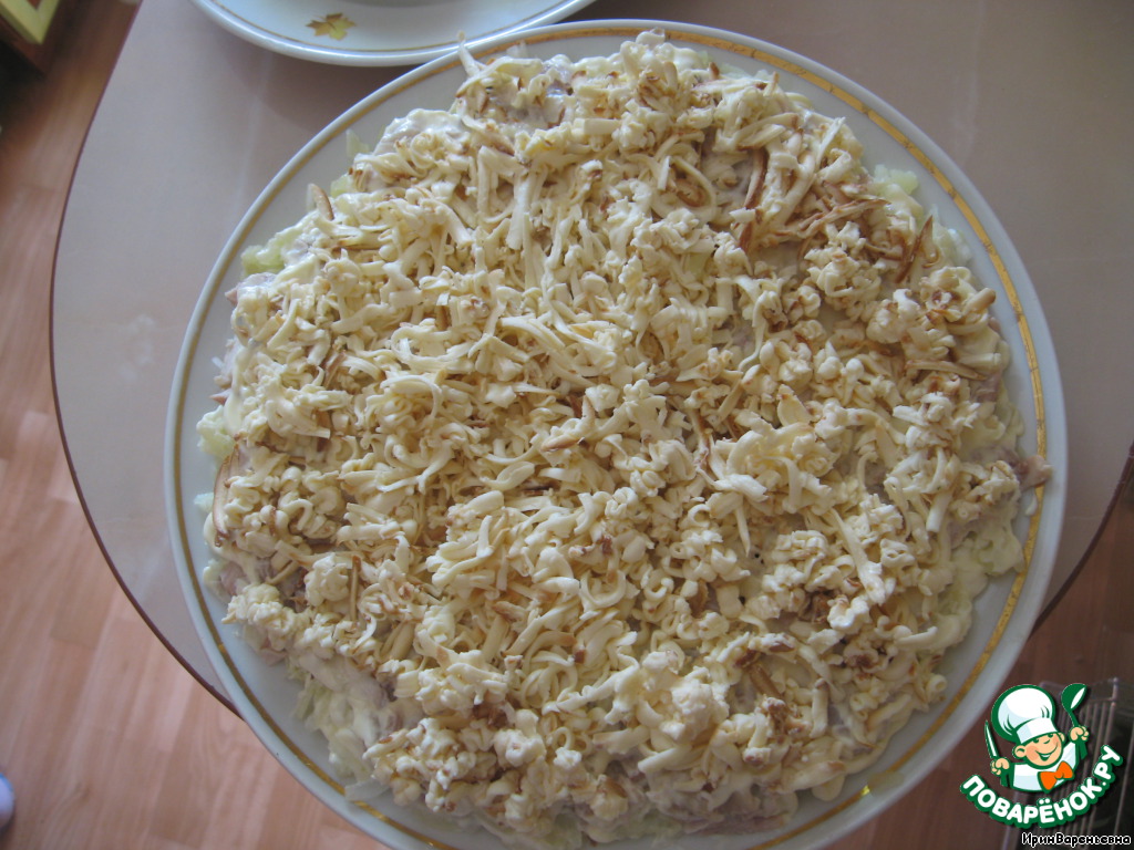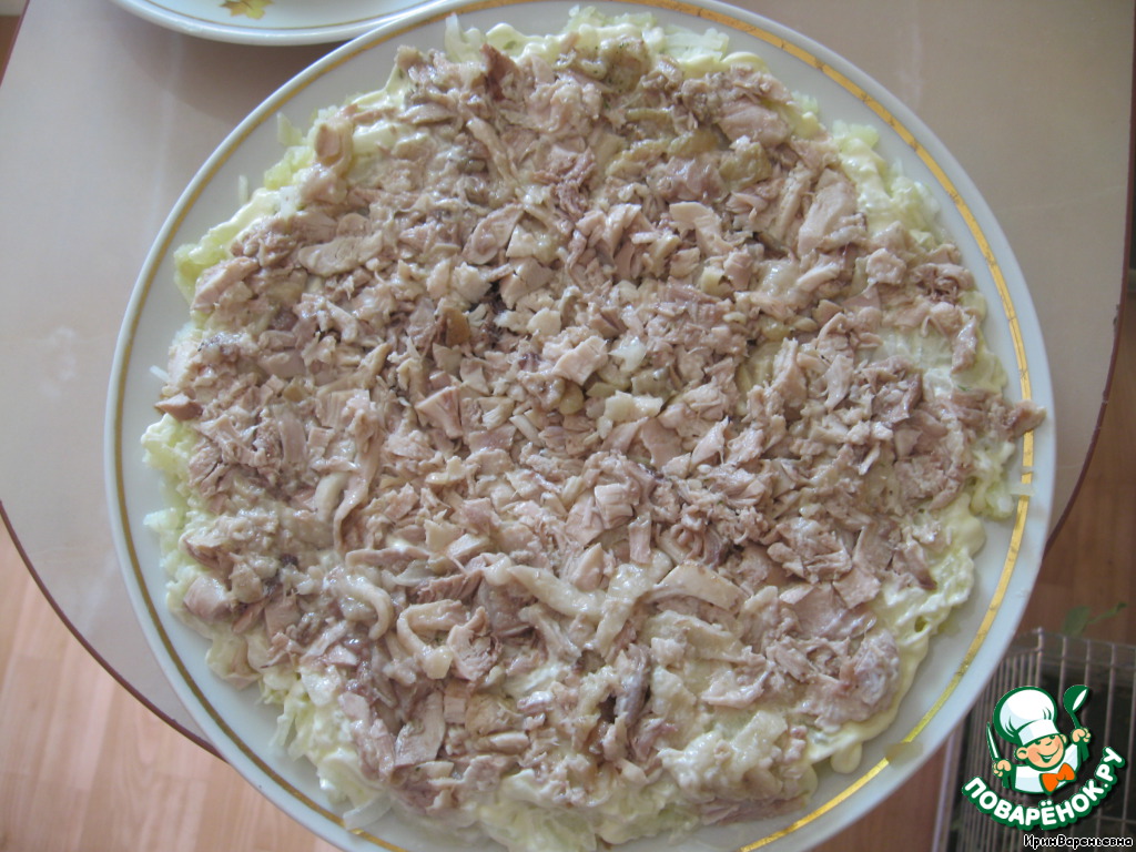 теперь выкладываем мясо, нарезанное на мелкие кусочки или разобранное на волокна...... и опять смазываем майонезом