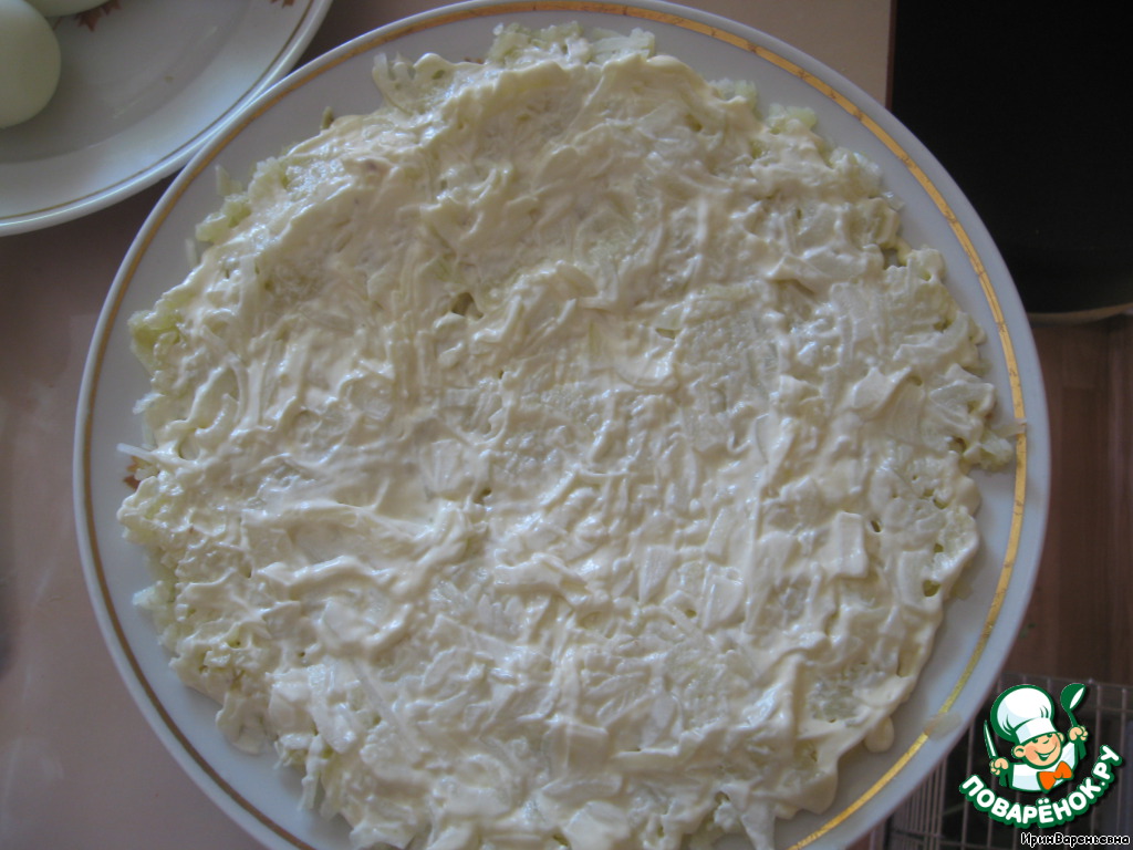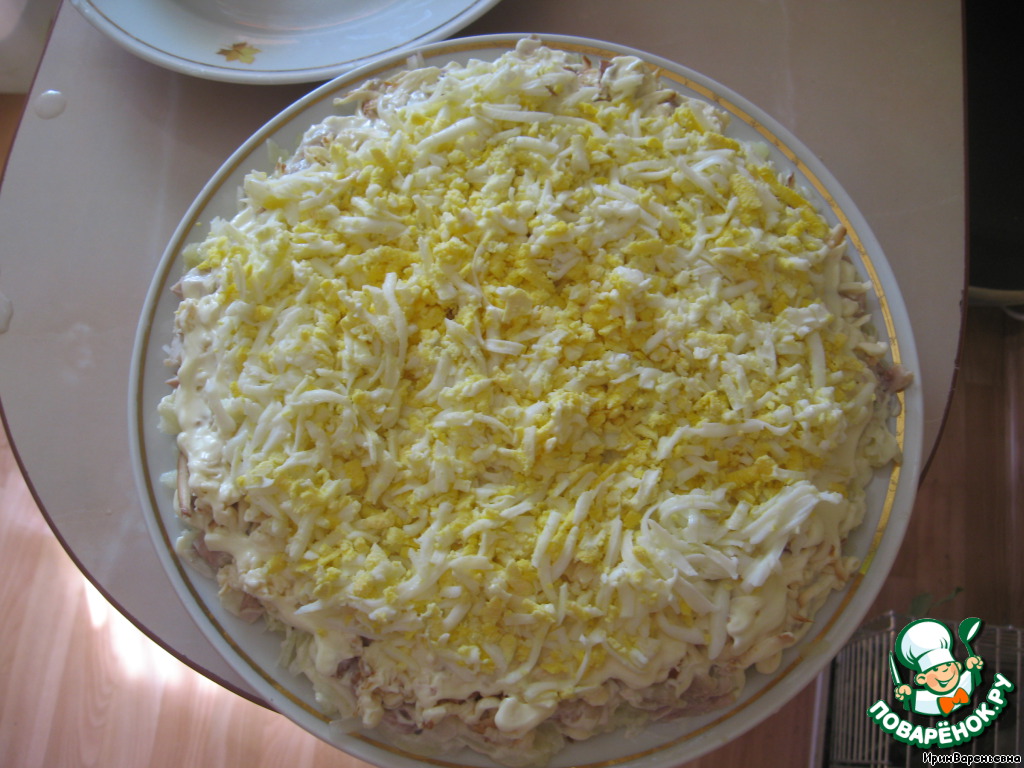 теперь на той же крупной терке завершающий слой - яйца+майонез