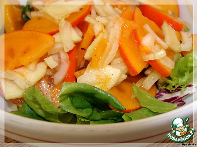 | Не говорите сразу:"Фи!", салат ОЧЕНЬ вкусный. Я давно на него поглядывала, только купленная хурма быстро исчезала, до салата не доживала. А сегодня сделала! Рецепт из "Крестьянки" 1997 г., автор рецепта Татьяна Коростылева, г. Валуйки Белгородской обл. Салат отлично подошел к запеченному белому амуру (рецепт поваренка "Лилька))"). |