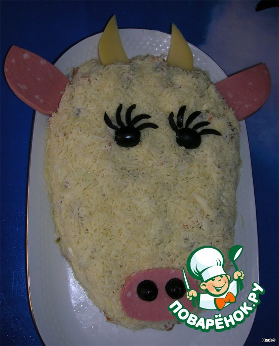 | Дорогие, Поварята, не обвините меня в плагиате, подобное оформление есть на сайте, но из других продуктов. А Это оформление я нашла на другом сайте, а рецепт сама придумала, чтобы соответствовал по содержанию и подходил Новому году Бычка. |