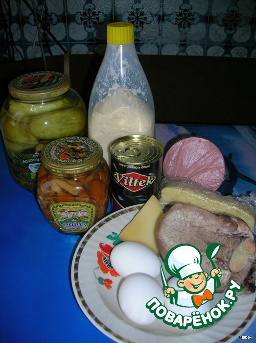 У меня был готовый варeный говяжий язык. Яйца отвариваем. Мелко нарезаем кубиками язык, яйца, огурцы, добавляем маринованные грибы, майонез, перемешиваем. Выкладываем на блюдо, формируя голову бычка. Натираем на мелкой тeрке сыр, покрываем им весь салат. Начинаем украшать. Делаем из твeрдого сыра рога, я взяла другой сорт, чтобы отличался от фона по цвету, Из варeной колбасы вырезаем нос (у чушки пятак, а у бычка не знаю, как называется), перерезаем пополам маслину, делаем ноздри. Ставим глазки-маслины, вырезаем ресницы из маслин. Из колбасы вырезаем уши.