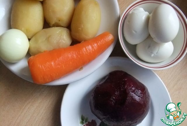 Время приготовления указано без учета времени варки овощей. Картофель, морковь, свеклу и яйца сварить накануне.