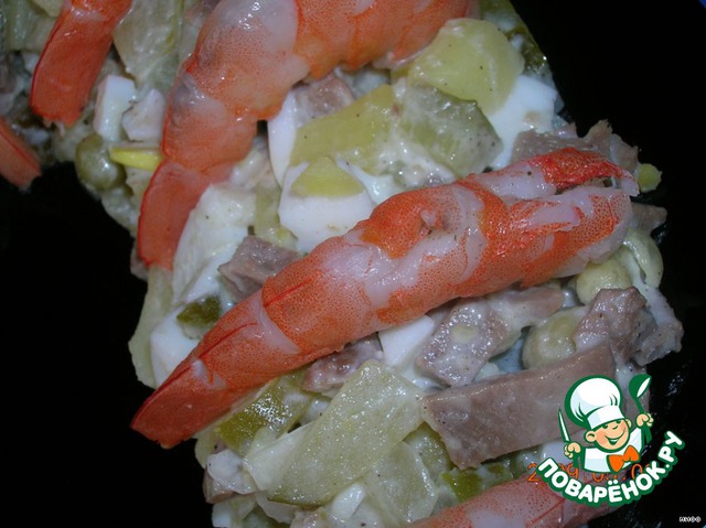 Все ингредиенты, кроме креветок, режем мелкими кубиками: картофель, яйца, язык, курицу, огурец, лук порей. Добавляем горошек, заправляем хреном, майонезом, чeрным перцем, солью.