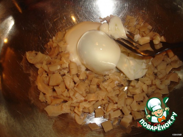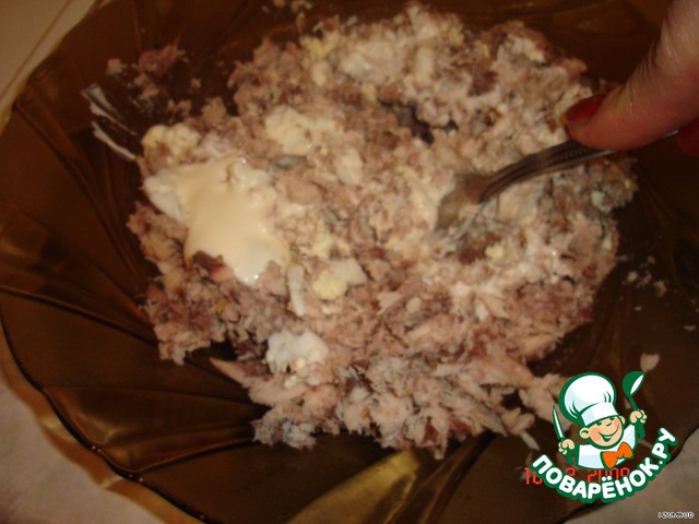 заправить майонезом и хорошо перемешать (майонеза много не добавляйте, а то масса получится жидкой и из неё будет трудно лепить)