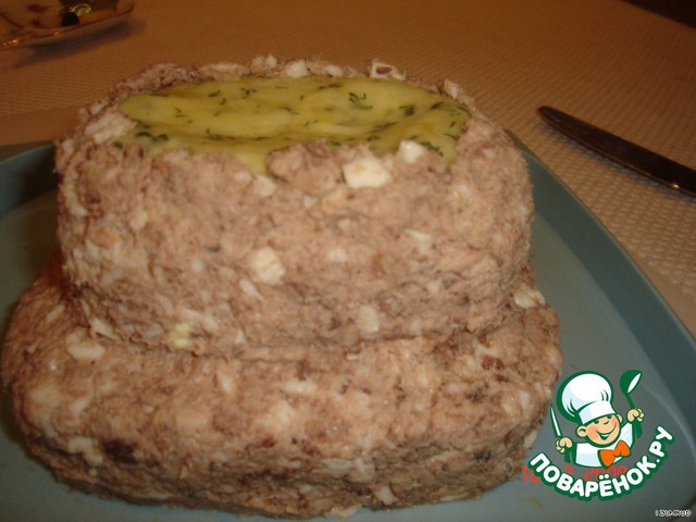 смесью из кальмаров выложить "шапочкой" верхнюю часть "вазы"