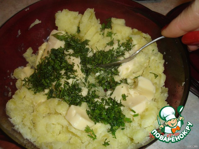картофель разогреть в СВЧ вместе с сыром "Хохланд" и добавив укроп мелко нарезанный хорошо перемешать