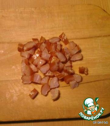 Нарезать копчёную курочку и добавить в салат. У меня вместо копчёной курочки было "карпаччо из птицы "Сетунь"" (так на ценнике в магазине было написано). Разница в том, что это карпаччо не коптят, а вымачивают в каком-то растворе с запахом копчёностей. Конечно, лучше, чтобы курочка была копчёная, а не вымоченная неизвестно в чём, хотя эта маленькая неприятность мой салатик не испортила.