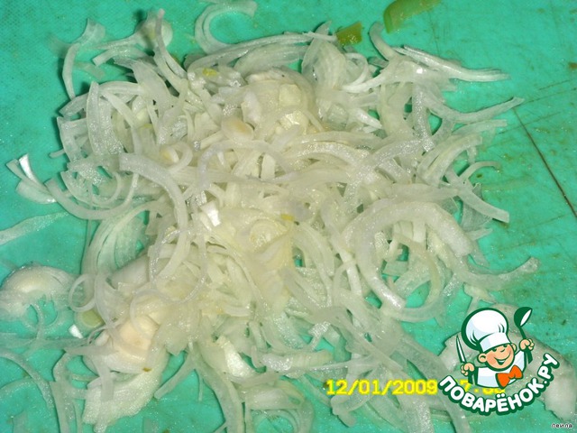 Шинкуем полукольцами лук,мнем пальчиками