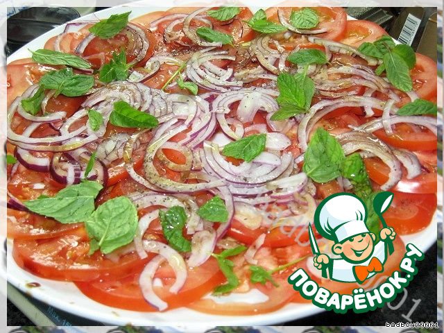Сверху нарезанный кольцами лук, зелень мяты с петрушкой.