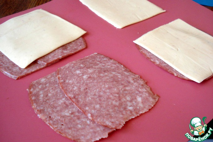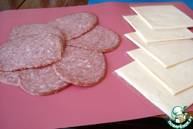 Салями режем тоненькими ломтиками (или берём готовую нарезку). Сыр любой, мягкий в пластинах.