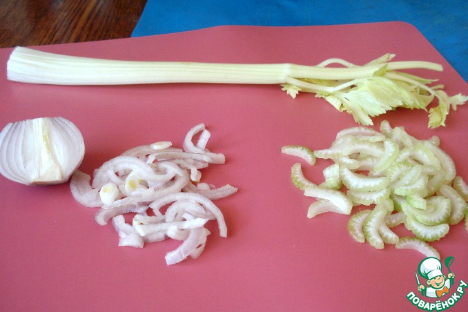 Лук тоненько режем полукольцами. Сельдерей тоненькими кусочками.