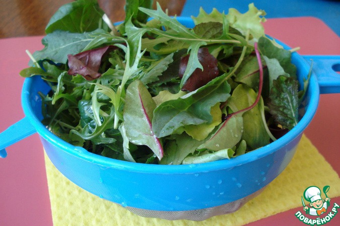 Салатный микс из молодых листьев моем и отставляем, чтобы стекла водичка и листья обсохли.