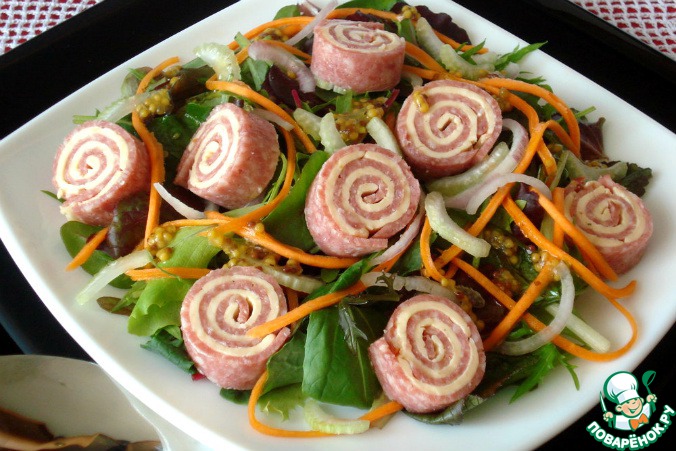 Далее салатный микс, морковь, лук и сельдерей перемешать, выложить в салатник. Посолить и заправить салат заправкой. Дополнить наш салат рулетиками из салями с сыром.