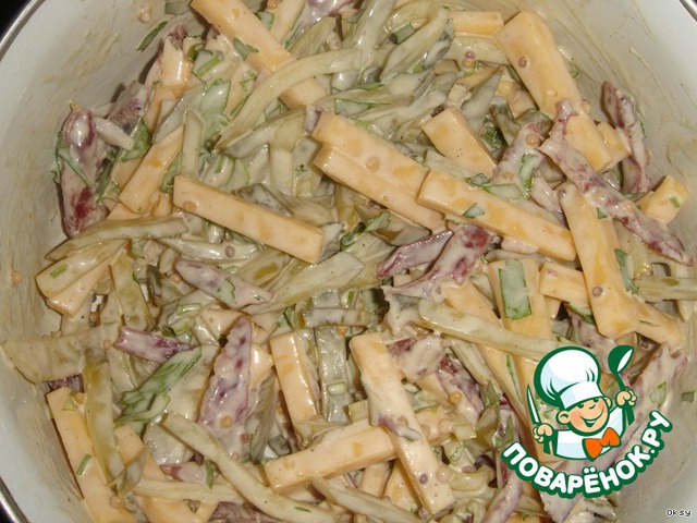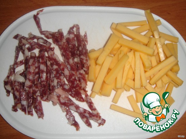 Колбасу и сыр порезать соломкой. Если ленитесь, сыр можно потереть на крупной терке.