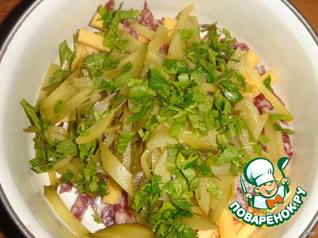 Добавить порезанные соломкой огурцы, рубленную зелень (у меня петрушка).