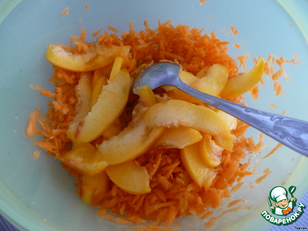 Персик очистить от кожуры и нарезать тонкими длинными ломтиками.
