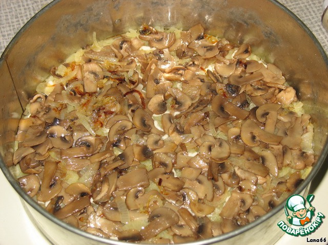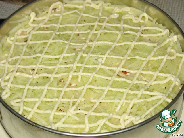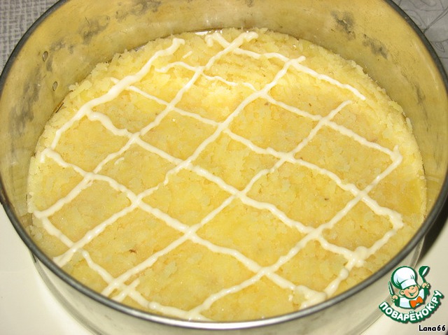 В форму диаметром 24 см укладываем послойно: картофель, тертый на терке, и майонезная сеточка. Чуть посолить.