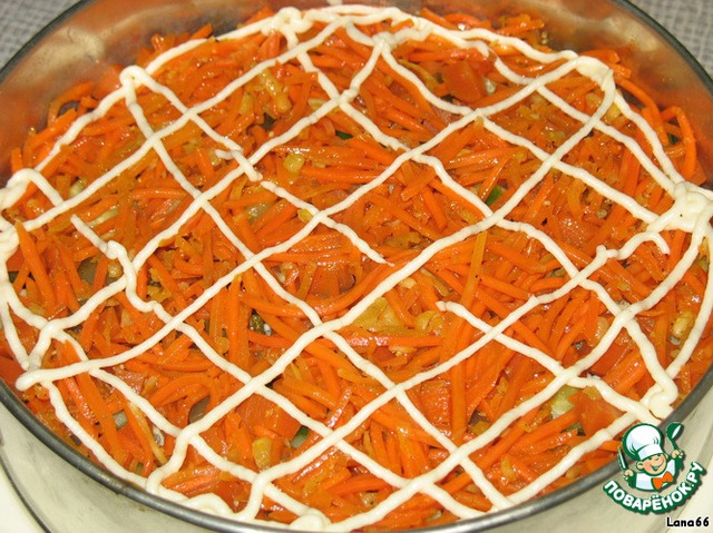 7 слой - салат "Морковка с сельдереем" в пластиковой баночке. Кладем на свой вкус. Майонезная сетка.