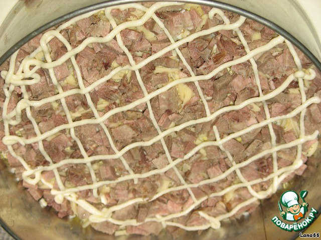 5 слой - вареный язык, порезанный кубиком. Майонезная сетка.