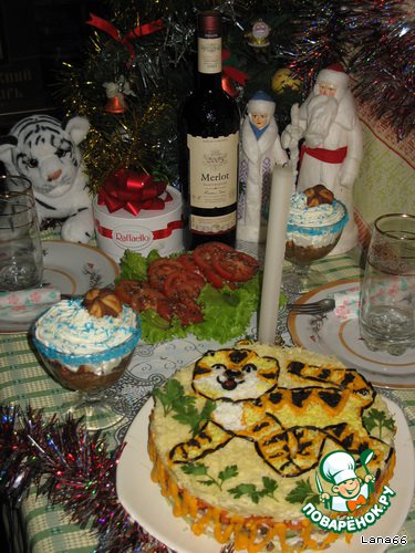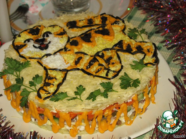| Салат очень насыщен разнообразием продуктов. На вершине его красуется символ 2010 года - ТИГР! А Тигрушей его назвали мои маленькие детки. Так наш праздничный салат был назван чисто по-детски и ласково. Пусть этот год всем принесет много здоровья, радости, удачи и счастья! На конкурс "Gorenje: новогодняя композиция". |