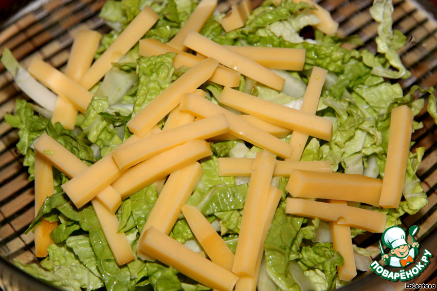 Острый сыр нарезать соломкой и добавить к салату.